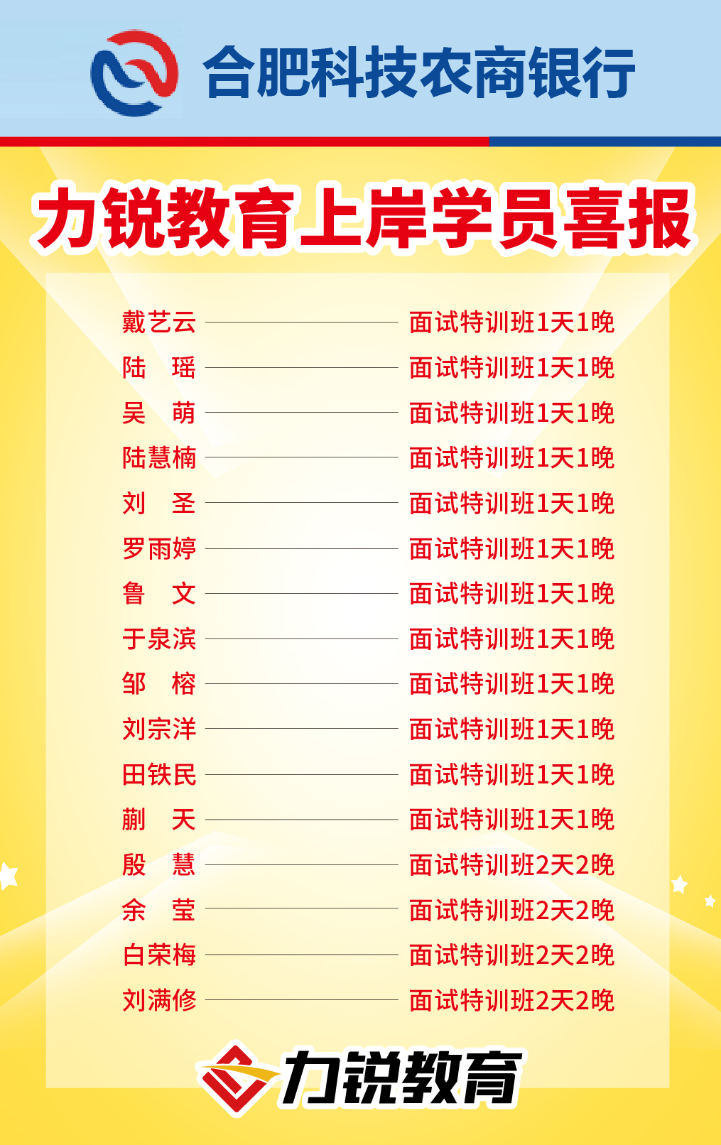 • 力锐教育liruijiaoyu.com合肥科技农村商业银行2020年新员工招聘面试通知公布如下: